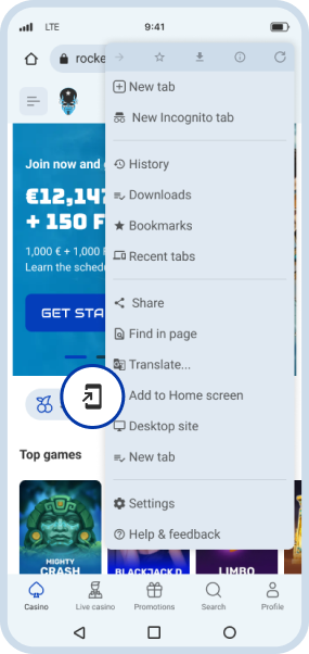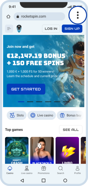 Gå til Rocket Spin-hjemmesiden og trykk på de tre prikkene for å åpne nettlesermenyen.