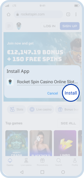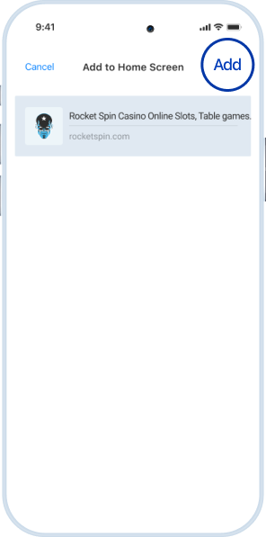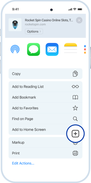 Åpne rocketspin.com med Safari, trykk på «Del» i bunnmenyen.